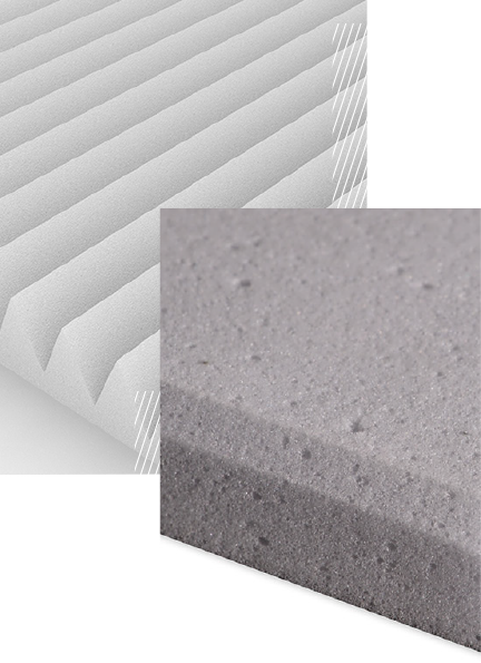 El material fonoabsorbente del cual están hechos los paneles acústicos ignífugos es espuma a base de resina de melamina, un material joven en comparación con las espumas de poliuretano o poliestireno, con un perfil de características realmente extraordinario. Es una espuma ultraligera, con una densidad de tan sólo 9 kg/m3 – 11 kg/m3, estructura semiflexible de celda abierta, posee una elevada resistencia al paso del tiempo, excelente resistencia al calor, bajo grado de inflamabilidad, baja generación de humo, no gotea en presencia de llama, no emite humos tóxicos y se carboniza sin dejar brasa.